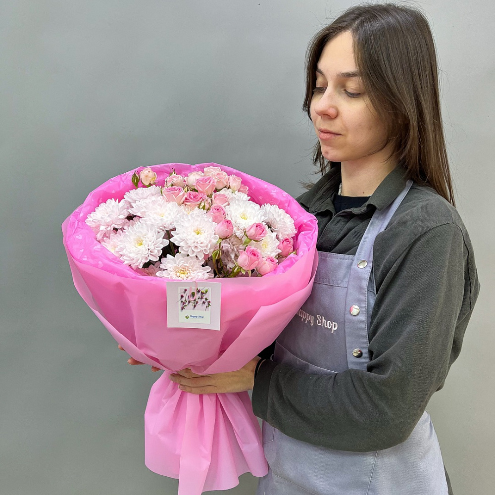 Трогательный букет в розовой гамме, сочетающий пушистые хризантемы и изящные розы. Романтичная упаковка делает этот подарок готовым признанием в самых искренних чувствах.