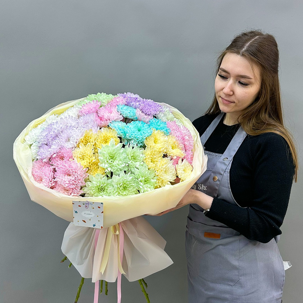 Пышный монобукет из 13 пушистых хризантем нежных пастельных оттенков. Тёплая упаковка подчёркивает мягкость и гармонию композиции, создавая образ уюта, счастья и искренней заботы. Идеальный подарок для выражения самых тёплых и светлых чувств.