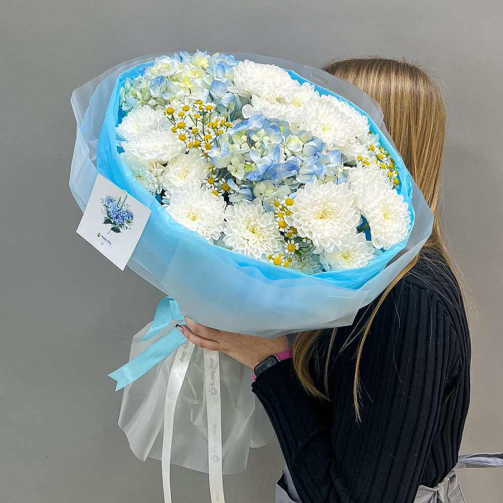 Воздушная и нежная композиция, сочетающая ажурный танацетум, чистоту хризантемы и пышность гортензии. Белоснежные и голубые оттенки цветов гармонично переплетаются, создавая образ, напоминающий лёгкое облако. Многослойная упаковка в нежно-голубую плёнку «тишью» и матовый внешний слой подчеркивают свежесть и прохладную элегантность букета, делая его идеальным для летнего настроения.