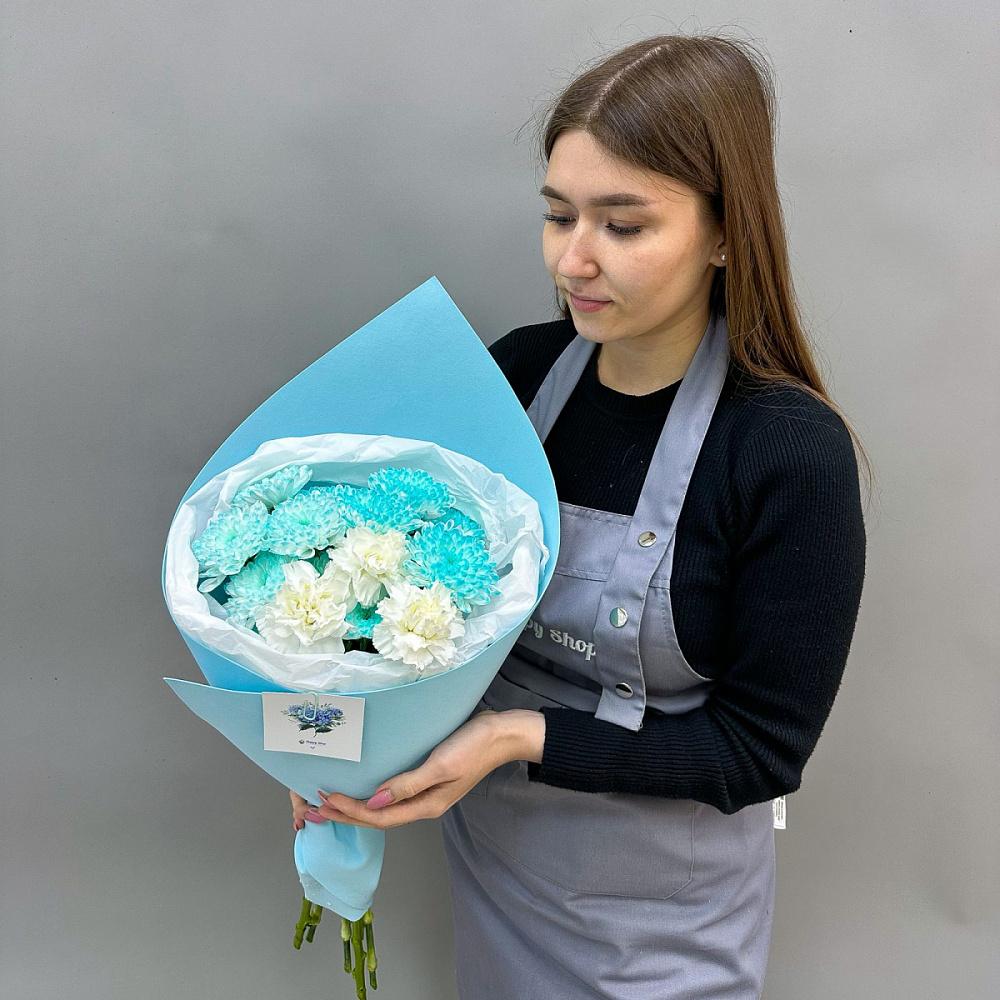 Нежный и воздушный букет, сочетающий кружевные диантусы и пышные хризантемы. Холодная цветовая гамма и лаконичное оформление создают образ свежести и умиротворения.