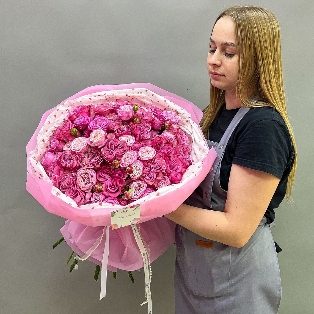 Роскошный букет из 25 нежно-розовых эквадорских роз и 10 пышных кустовых роз. Разные оттенки розового, объединенные в одной композиции, создают образ утонченной женственности и нежной любви. Элегантная упаковка с сердцами подчеркивает романтичность подарка.