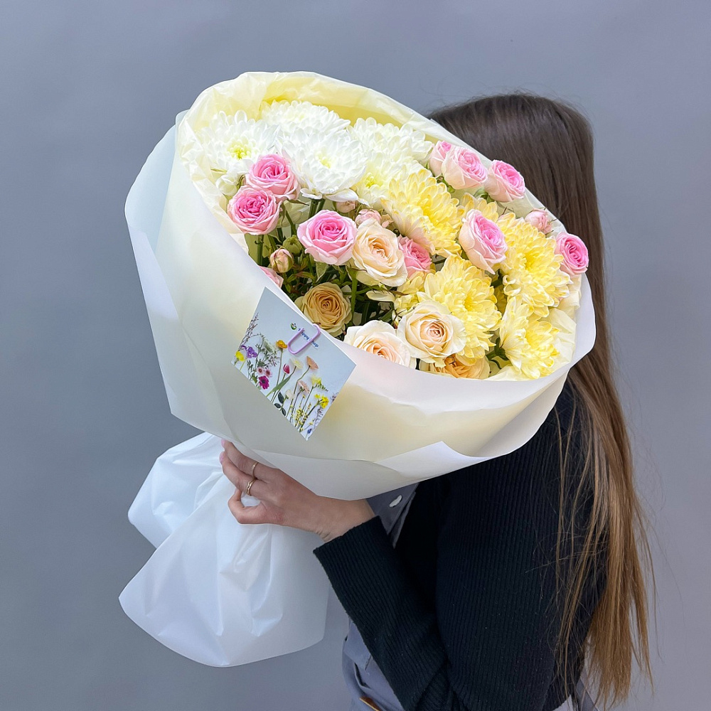 Камерный и утонченный букет, объединяющий четыре нежных оттенка в одной гармоничной композиции. Нежные розы в обрамлении пушистых хризантем создают образ трепетной, искренней симпатии. Идеальный выбор для небольшого, но очень личного подарка.