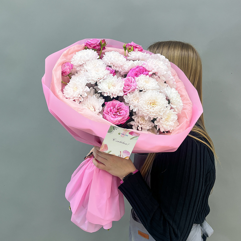 Подарите любимой воплощение нежности и элегантности! Этот гармоничный букет объединил два прекрасных нежных оттенка. Три роскошные розы с их пышными, многослойными бутонами нежного -розового оттенка символизируют восхищение, изысканность и безупречный вкус. Четыре воздушные хризантемы пастельных тонов создают мягкий, объёмный фон, олицетворяя гармонию, уют и долголетие чувств.