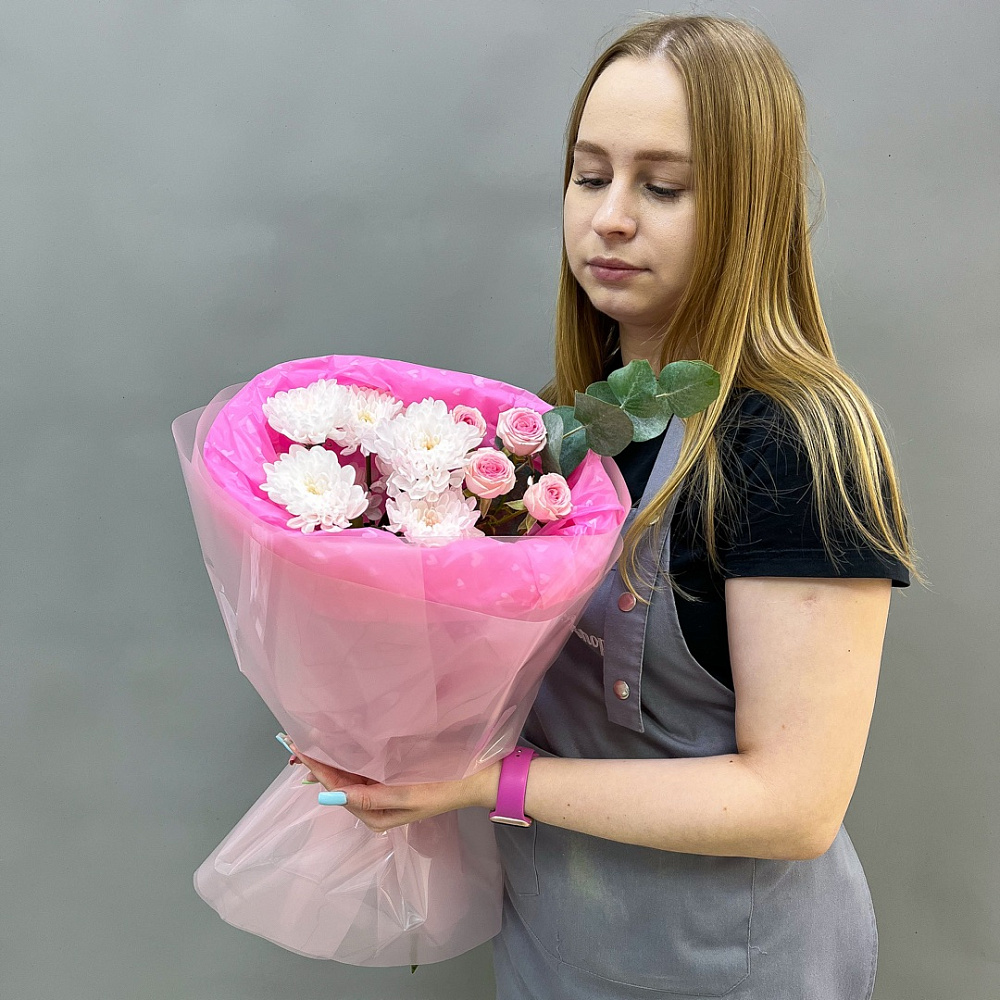 Камерный и утончённый мини-букет, объединяющий три нежных цветка в одной гармоничной композиции. Пушистая хризантема, аристократичный эвкалипт и изящная роза в мягком розовом оформлении. Идеальный выбор для небольшого, но очень трогательного и искреннего подарка.
