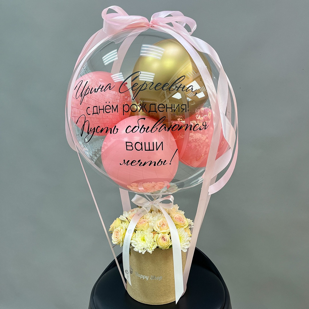 Эффектная композиция в крафтовой коробке, объединяющая нежные розы и хризантемы с шаром-баблом, наполненным воздушными шарами. Стильное оформление и персонализированная надпись создают образ современного, запоминающегося подарка для особенного признания.