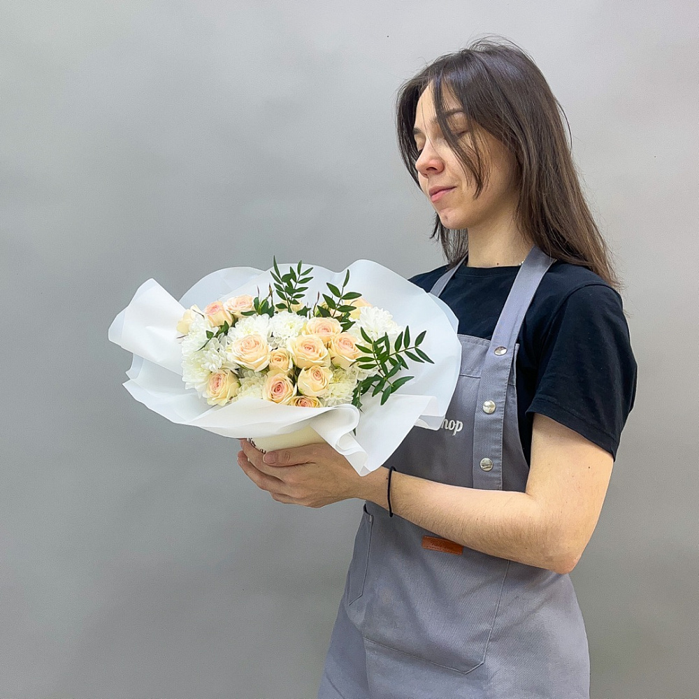 Элегантная композиция в коробке-цилиндре цвета слоновой кости, сочетающая нежные хризантемы, розы с персиковым румянцем и ажурную зелень фисташки. Минималистичное оформление подчеркивает утонченность и гармонию природных линий.