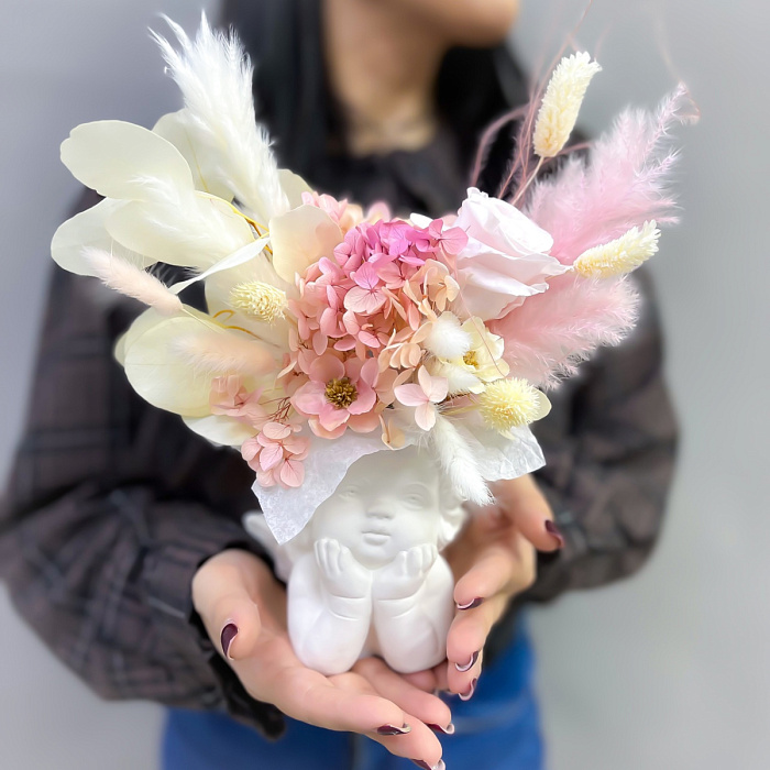 Композиция из сухоцветов в кашпо мечтающего ангела Сет 1896