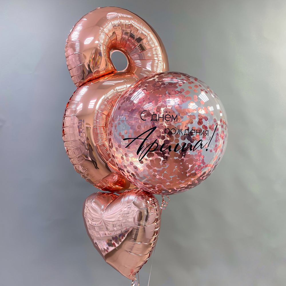 Создайте атмосферу настоящего праздника с великолепным воздушным фонтаном в стильной цветовой гамме «розовое золото». Композиция состоит из шаров разных форм и размеров, включая шар-цифру, сердце и шар с конфетти, украшенный индивидуальной надписью. Такой фонтан станет идеальным подарком на день рождения, создаст яркий акцент на вашем мероприятии и станет прекрасным фоном для фотографий.