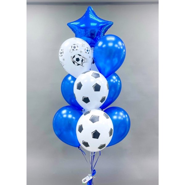 Фонтан: шар 12" дм (30 см) металлик синий - 5 шт; Шар 12"дм С РИСУНКОМ ГЕЛИЕВЫЙ Футбольный мяч - 5 шт; Шар 18"дм ЗВЕЗДА БЕЗ РИСУНКА синяя - 1 шт; 2 см бант сатиновый белый с логотипом – 1 шт; бант