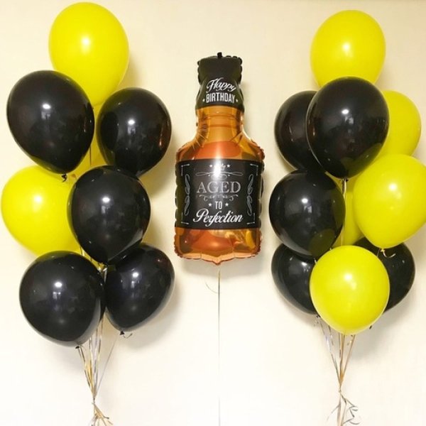 Фонтан: Шар 12"дм "Т" Веселуха пастель ЖЁЛТЫЙ- 5шт Шар 12"дм "Т" Веселуха пастель ЧЁРНЫЙ- 5шт 2 см бант сатиновый белый с логотипом – 1 шт; Лента Атлас Желтый 2,5 см Фонтан второй: аналогичный Шар 40"дм ФИГУРА Виски Совершенный возраст- 1шт