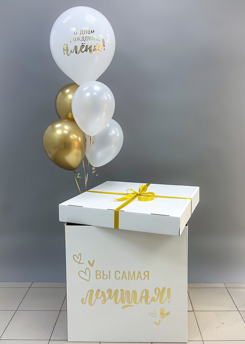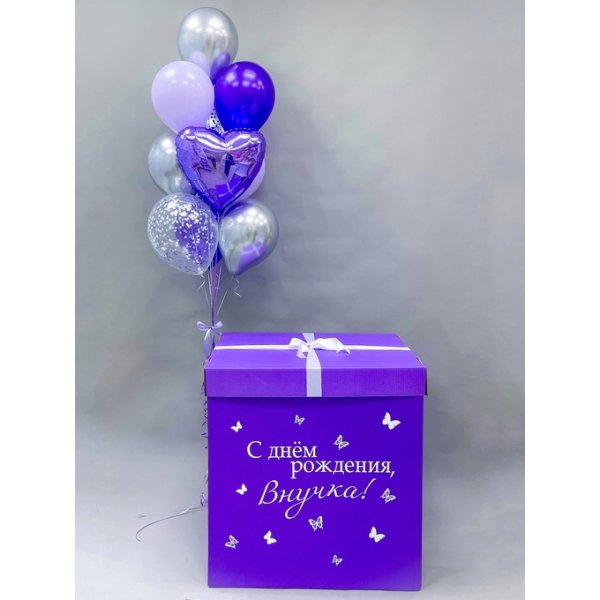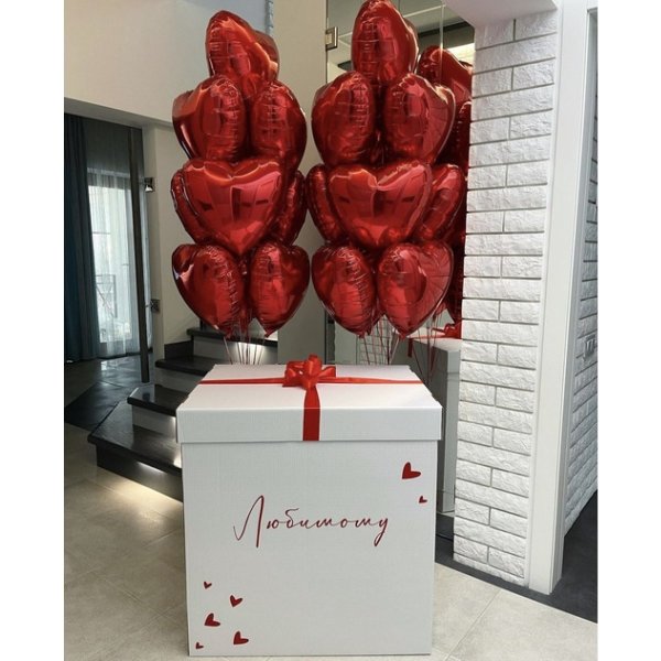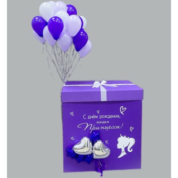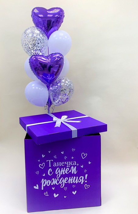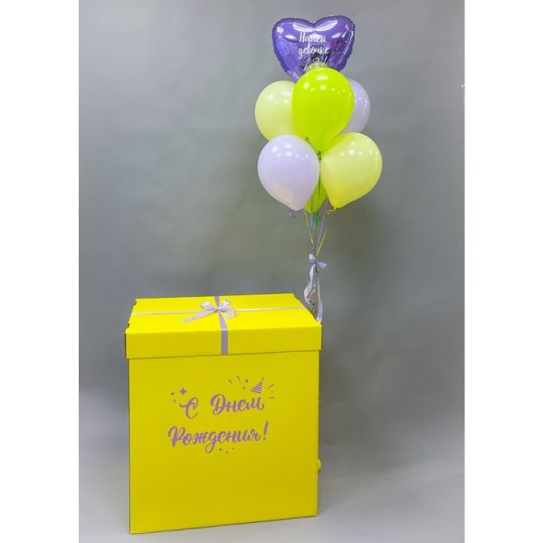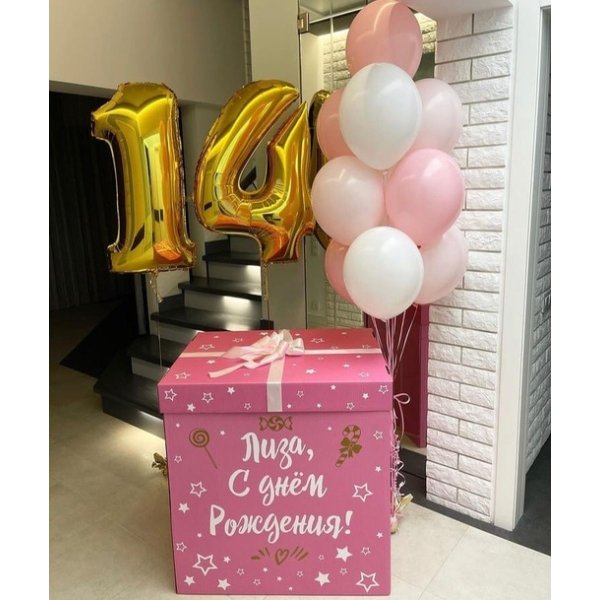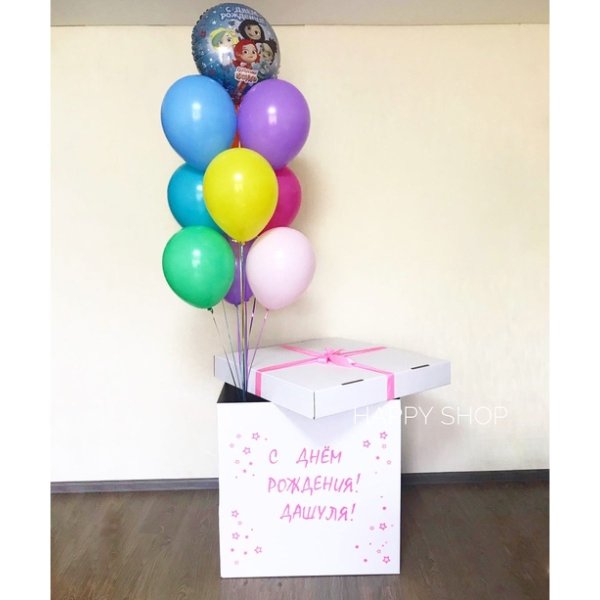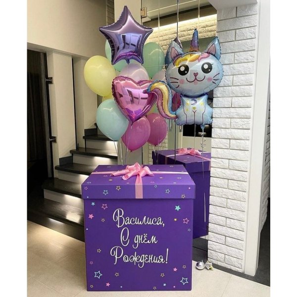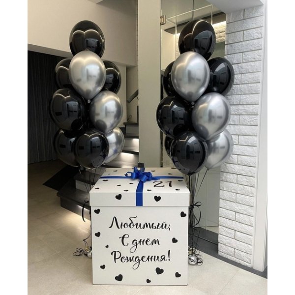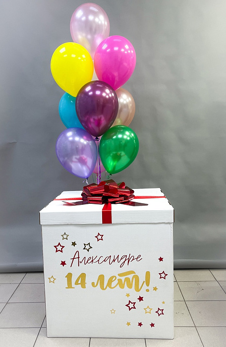 Большая подарочная коробка, внутри которой спрятаны гелиевые шары. При открытии крышки они эффектно взмывают вверх, создавая праздничную атмосферу.