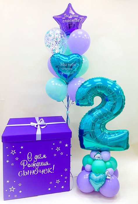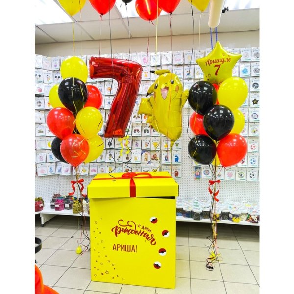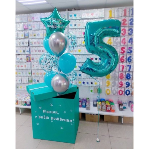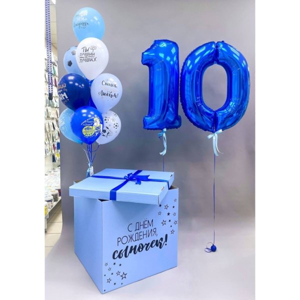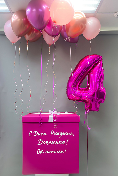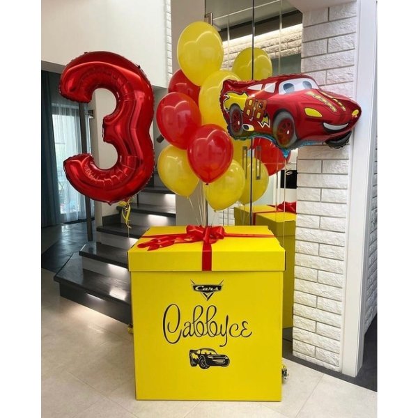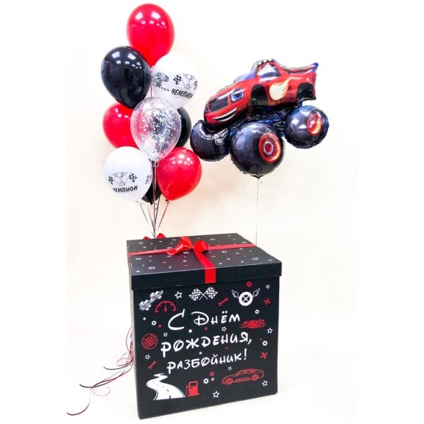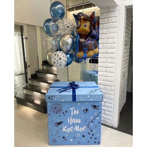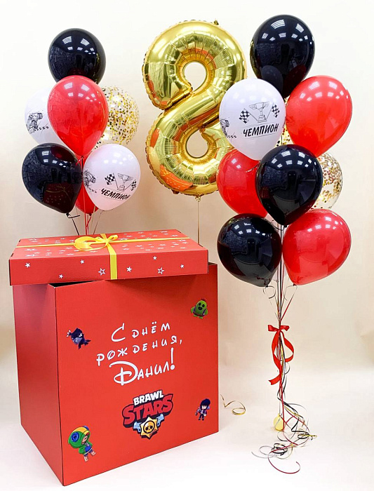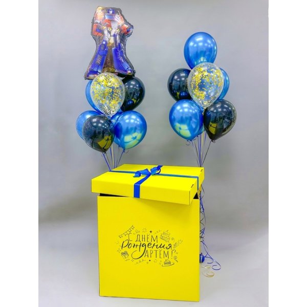 Большая подарочная коробка, внутри которой спрятаны гелиевые шары. При открытии крышки они эффектно взмывают вверх, создавая праздничную атмосферу.