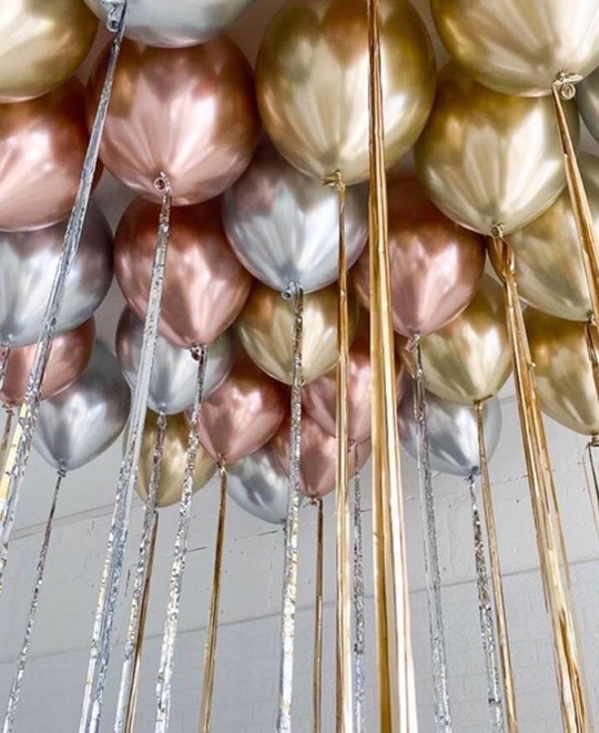 Шары в потолок на дождике: Шар 12 дм (30 см) хром золото – 9 шт; Шар 12 дм (30 см) хром розовое золото – 8 шт; Шар 12 дм (30 см) хром серебро – 7 шт;