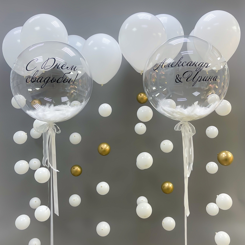 Набор создан для атмосферы утонченного праздника! Белоснежные шары с мерцающими капельками, нежные перья и элегантные банты подчеркнут торжественность момента и станут изысканным украшением свадебного декора.