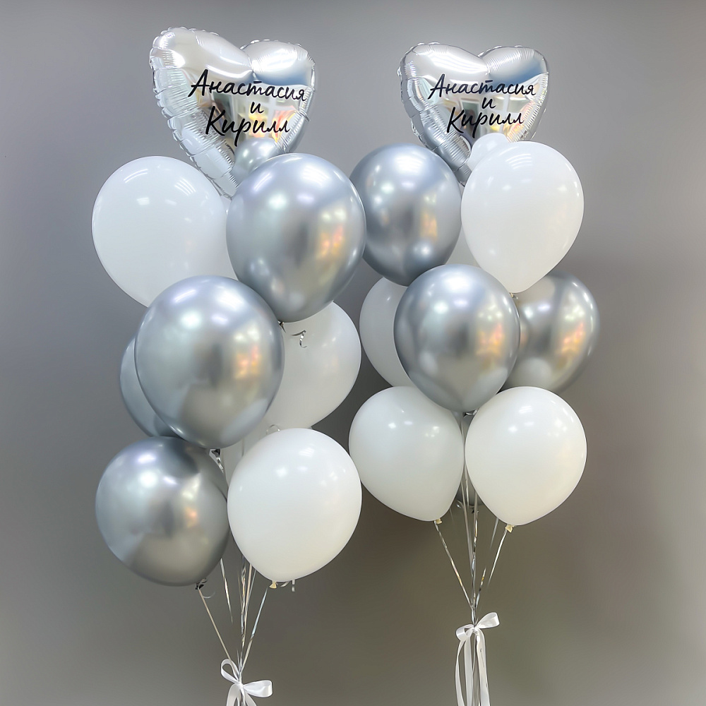 Композиция "Серебряная симфония" — это воплощение сдержанной роскоши и гармонии. Два идентичных фонтана с серебряными сердцами и шарами создают атмосферу утонченного праздника, идеально подходящую для свадеб, юбилеев и торжественных мероприятий.