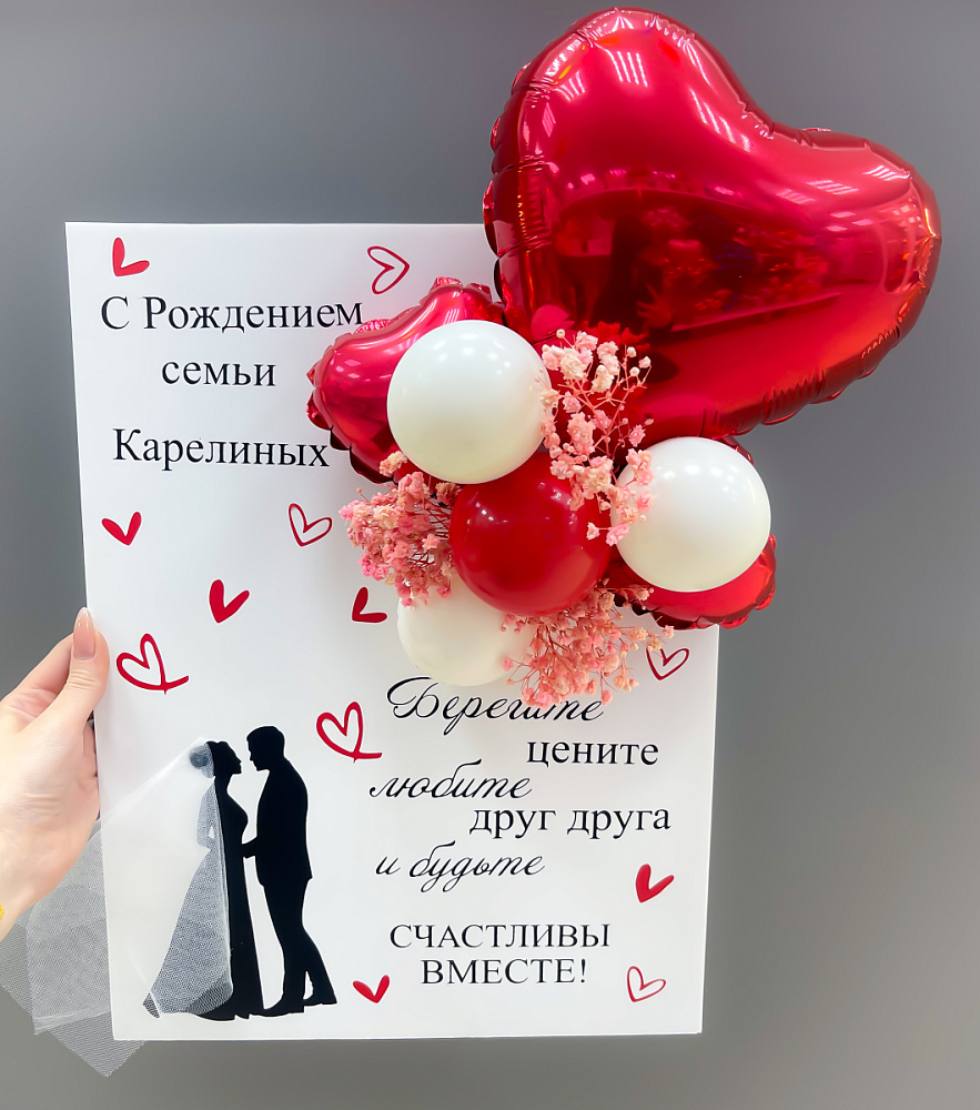 Превратите поздравление в произведение искусства! Роскошная открытка ручной работы формата 30×40 см с авторским дизайном создана специально для свадебных поздравлений. Элегантный дизайн с объемными шарами и романтичными акцентами станет памятным подарком для молодоженов. Композиция сочетает в себе: силуэт жениха и невесты с фатой, объёмные красные сердца и латексные шары, красные сердечки для декора, индивидуальные надписи.